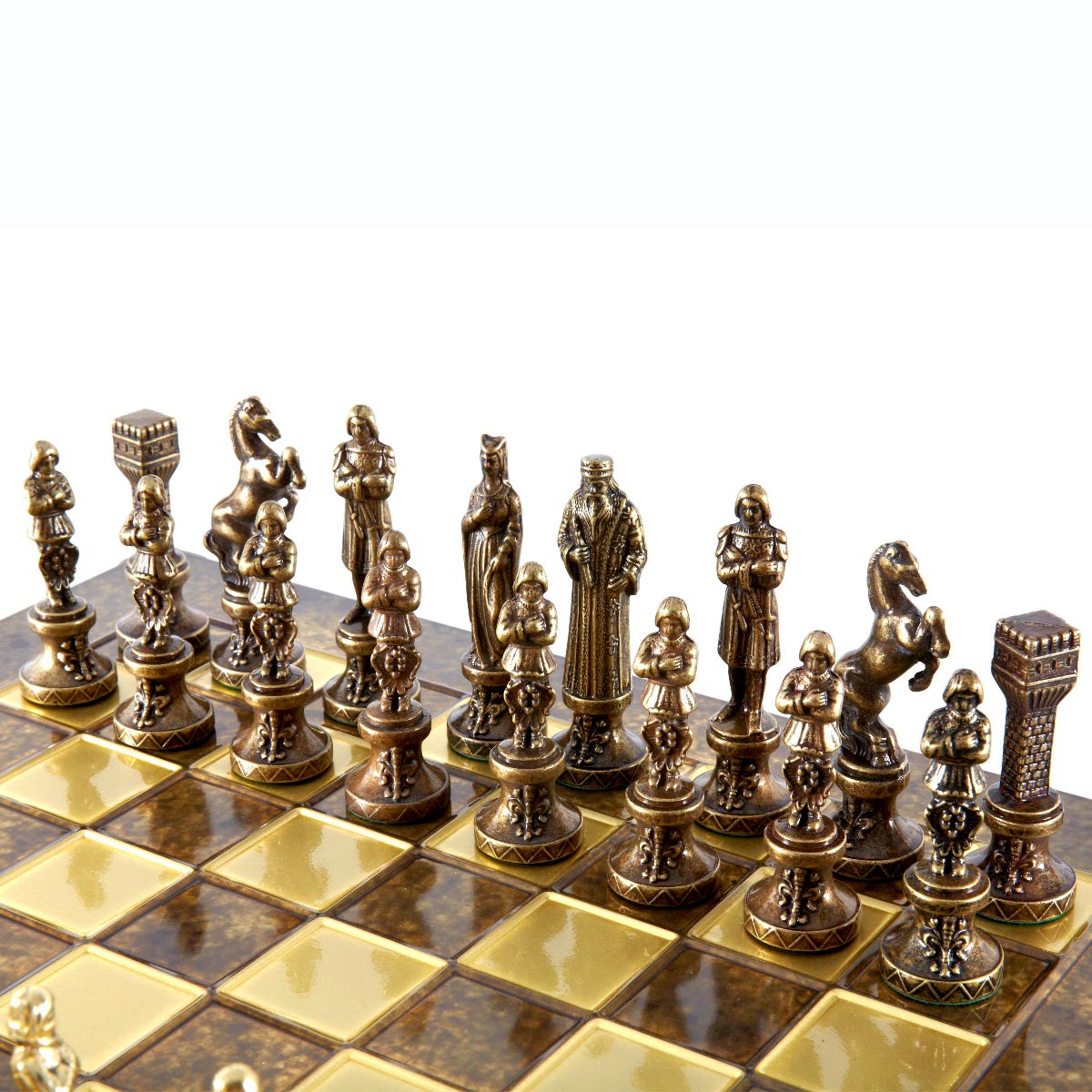 В этом наборе шахматная доска – коричневая; фигуры цвета золота и бронзы.