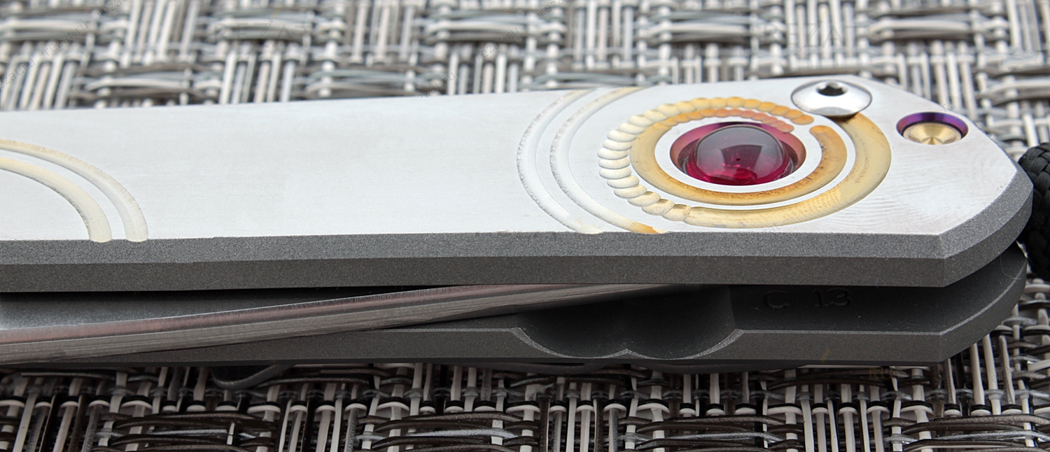 Содержит : Рукоять ножа инкрустирована искусственным рубином, обработанным методом кабошон