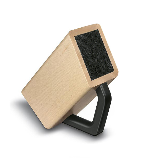 Подставка для ножей занимает минимум места на кухне, наличие ручки позволяет легко и быстро перемещать её. Конструкция подставки предусматривает два положения: вертикальное и наклонное. Нейлоновый наполнитель позволяет произвольно выбрать место для ножа в подставке, препятствует образованию плесени и коррозии ножей
