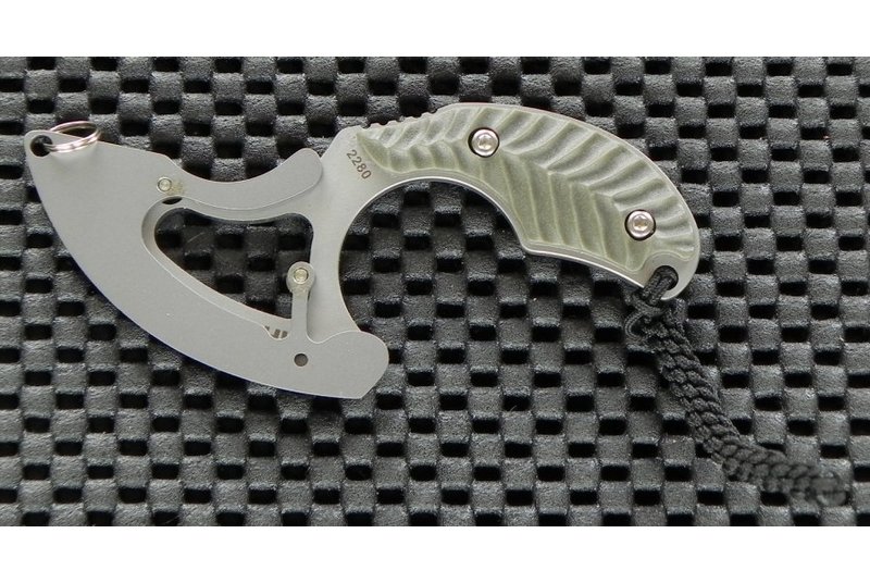 Изюминкой ножа являются оригинальные стальные ножны-чехол с небольшим колечком (диаметр 8 мм) для крепления к связке ключей или к цепочке при ношении его на шее. Размеры ножен – 5,7 х 3,2 см, вес – 9 грамм. Конструкция ножен позволяет одним движением извлечь из них клинок.