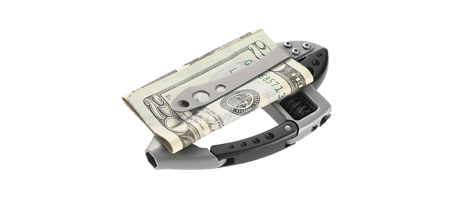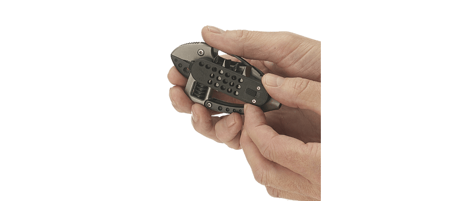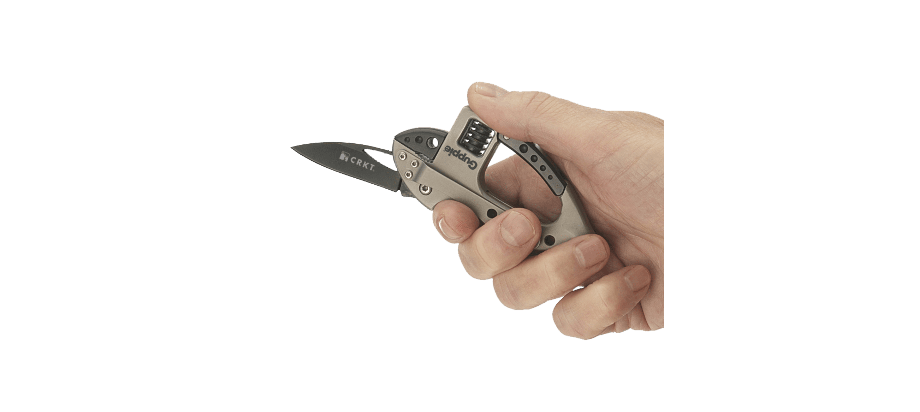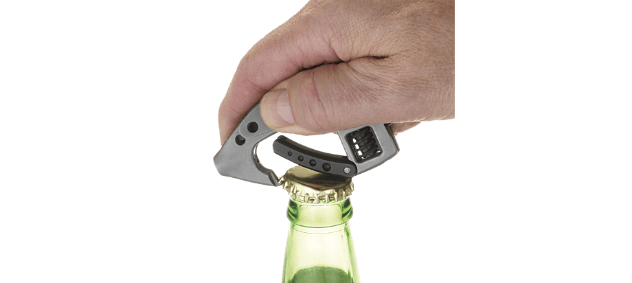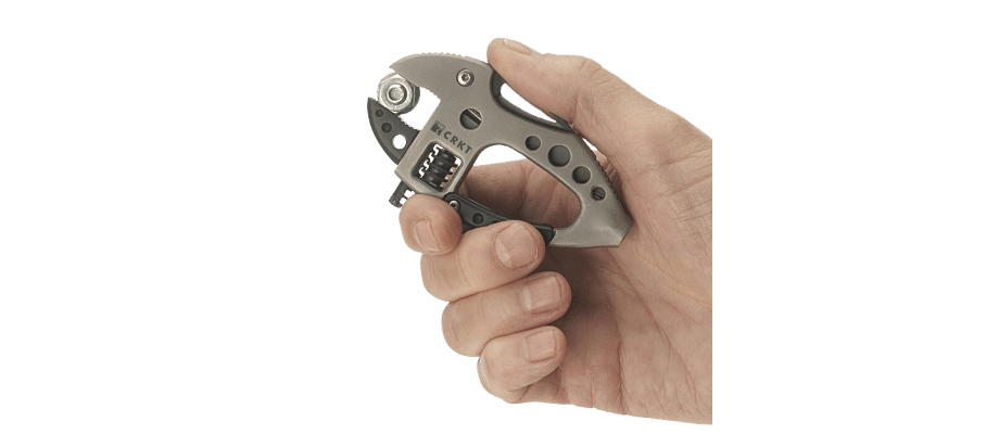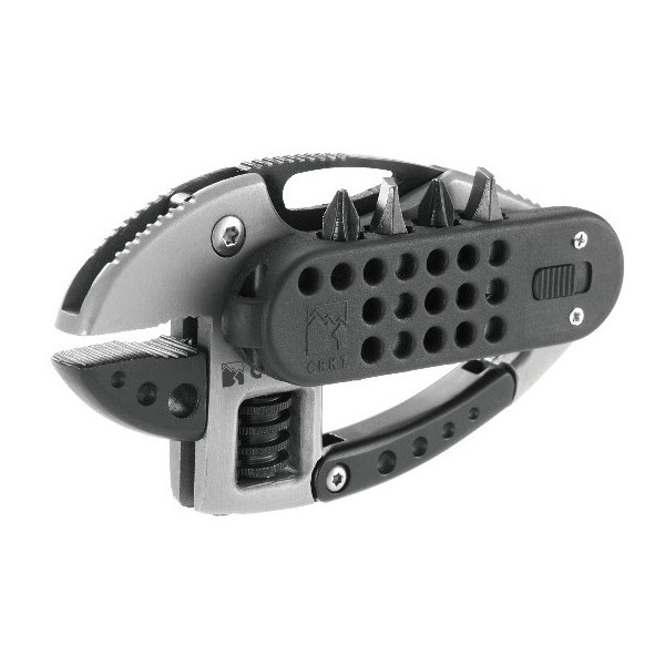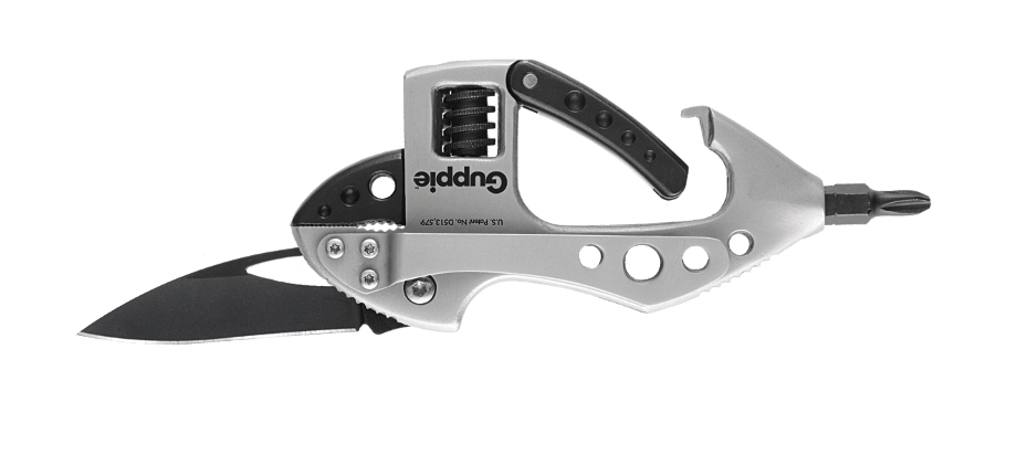 Инструмент CRKT 9070 "Guppie", выполненный в виде карабина, который можно использовать для десятка различных слесарных и монтажных работ. Нож, разводной ключ, битодержатель, 4 биты (2 плоские и 2 крестовые), встроенный фонарик, открывалка для бутылок.