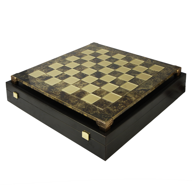 В этом наборе шахматная доска – коричневая; фигуры цвета золота и серебра.